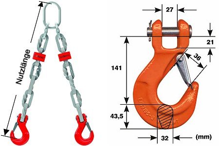 Textile Anschlagkette DoNova® PowerLift mit Kettentyp 25/10 und DoNova® Gabelkopfhaken. 2-strängige Ausführung mit ovalem Aufhängering. Tragkraft 8820kg (0-45°) 6300kg (>45-60°). Nutzlängen von 2m bis 4m wählbar