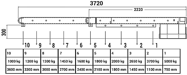6-fach ausziehbarer Kranarm mit 5000kg Traglast, nicht höhenverstellbar, 3720mm Maximallänge, 2220mm Mindestlänge. Feuerverzinkt oder farblich pulverbeschichtet. Standardfarbe RAL 5010 (enzianblau). Weitere RAL-Farben stehen zur Auswahl.